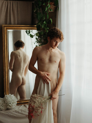 Mon tout premier test est cette série d'autoportraits, réalisée un après midi lumineux. J'incorporais pour la première fois des drapés et des fleurs. Le fond plus sombre m'a permit de faire ressortir la peau et les éléments blancs du décor en premier plan. La lumière latérale construit les volumes.